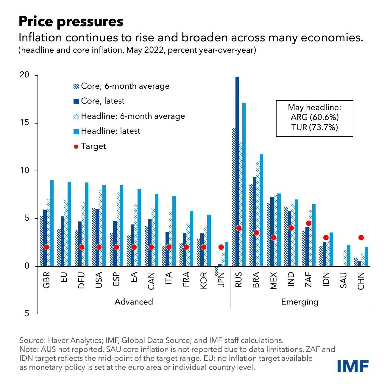 Inflation is higher than expected and has broadened beyond food and energy prices. This has prompted major central banks to announce further monetary tightening—which is necessary but will weigh on the recovery. Continuing pandemic-related disruptions—especially in China—and renewed bottlenecks in global supply chains have hampered economic activity.