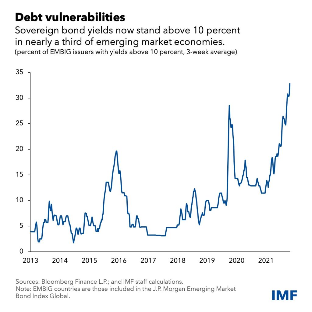 Already, sovereign FX bond yields have reached more than 10 percent in around a third of emerging economies—close to the highs last seen after the global financial crisis. Emerging economies with a greater reliance on domestic borrowing, such as in Asia, have been more insulated. But a broadening of inflation pressures and the attendant need to tighten domestic monetary policy faster could change the calculation.