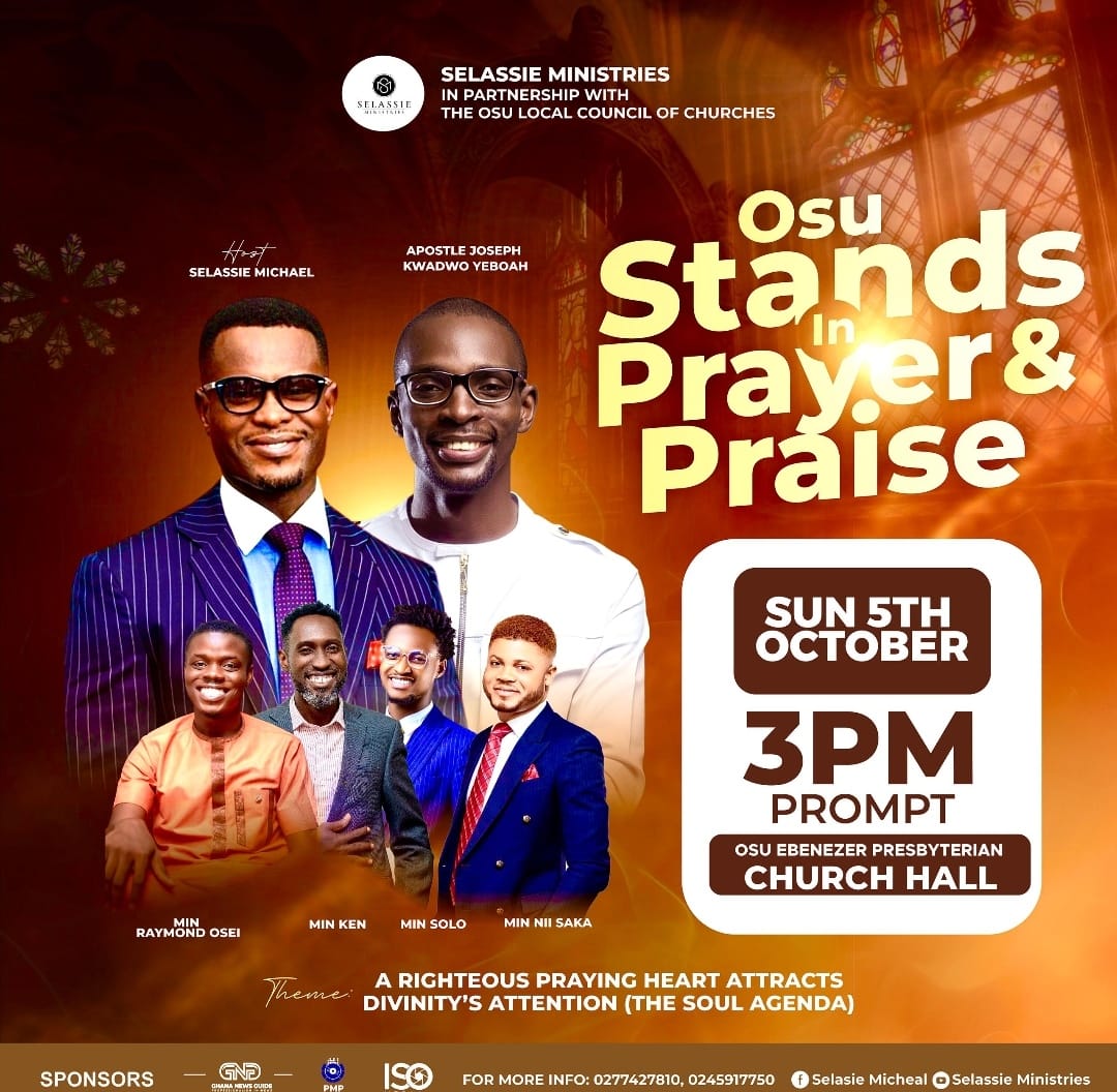 Accra, Ghana – October 2, 2025 – Selassie Ministries, in partnership with the Osu Local Council of Churches, will on Sunday, October 5, 2025, host a major interdenominational worship gathering dubbed “Osu Stands in Prayer & Praise.”