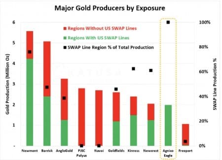 Here’s a chart of the ten largest gold producing companies in the world, and their exposure to -SWAP (negative SWAP Line Nations) in red: