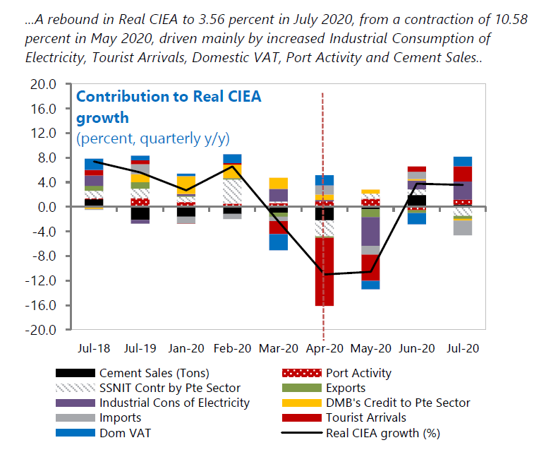 The central bank’s Composite Index of Economic Activity (CIEA) recorded a recovery in real terms, of 3.6 percent for July 2020, compared with a contraction of 10.6 percent recorded in May. According to the Ghana Statistical Service (GSS) Ghana’s economy contracted by 3.2 percent in the second quarter of this year, a decline from the 5.7 percentage growth recorded during the same period in 2019.