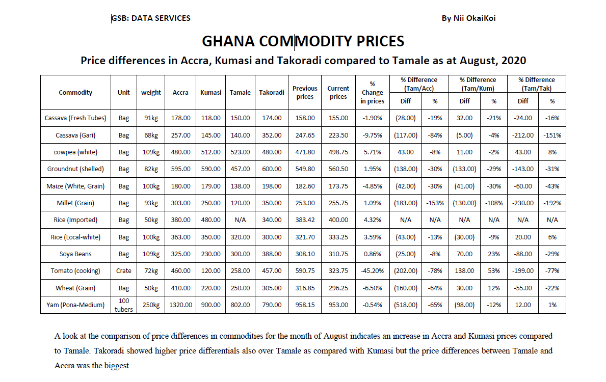 A look at the comparison of price differences in commodities for the month of August indicates an increase in Accra and Kumasi prices compared to Tamale. Takoradi showed higher price differentials also over Tamale as compared with Kumasi but the price differences between Tamale and Accra was the biggest. GSB Data On Commodities, September 23, 2020