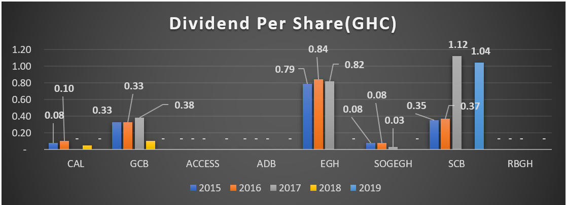 The profits translated into the dividends paid by the companies. The banks have been consistent in paying dividends. In 2018, CAL Bank, Ecobank Ghana, Standard Chartered Bank Societe Generale Ghana issued bonus shares at the ratios of 7:1, 10:1, 6:1 and 6:1 respectively. Republic Bank did a Rights Issue.