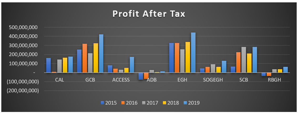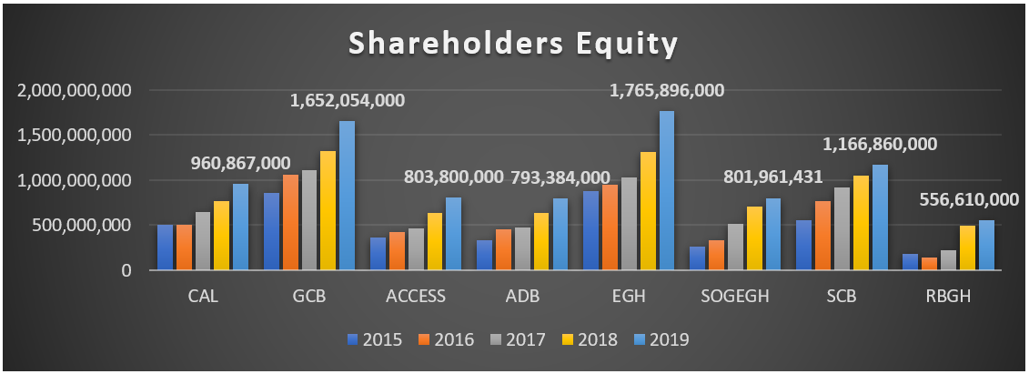 Shareholders’ Funds of the banks put together grew by 20% on average. GCB grew by 28% while Standard Chartered Bank grew by about 23%. ACCESS Bank saw the biggest jump from 2018 to 2019 by 33.06% and CAL Bank followed by 30%. As at 2019, Ecobank Ghana’s shareholders’ funds stood at GHC1.7Billion whiles GCB stood at GHC1.6 Billion.