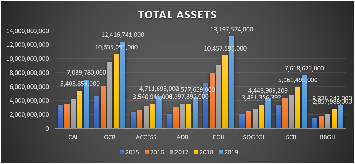 Ecobank Ghana solidified its position as the biggest bank in Ghana in assets when its asset grew to GHC13.2 Billion in 2019. GCB and SCB also grew by 17% and 28% respectively to GHC 12.4 Billion and GHC7.6 B. Societe Generale, Republic Bank, ADB and Access all saw increases in asset values.